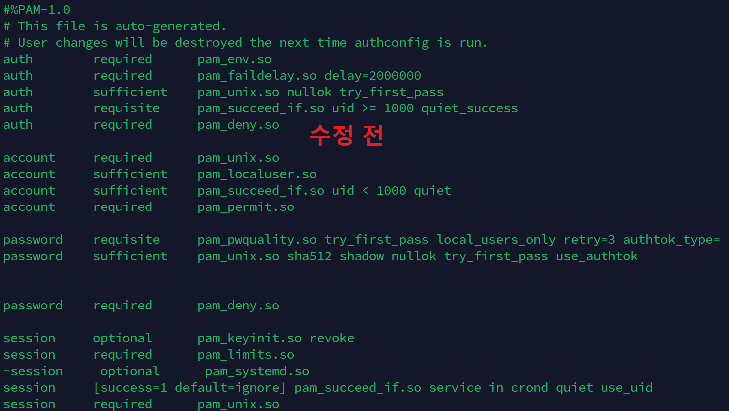 - system-auth 파일의 경우 콘솔을 통한 로그인 및 su 전환 시 임계값을 설정할 수 있습니다.