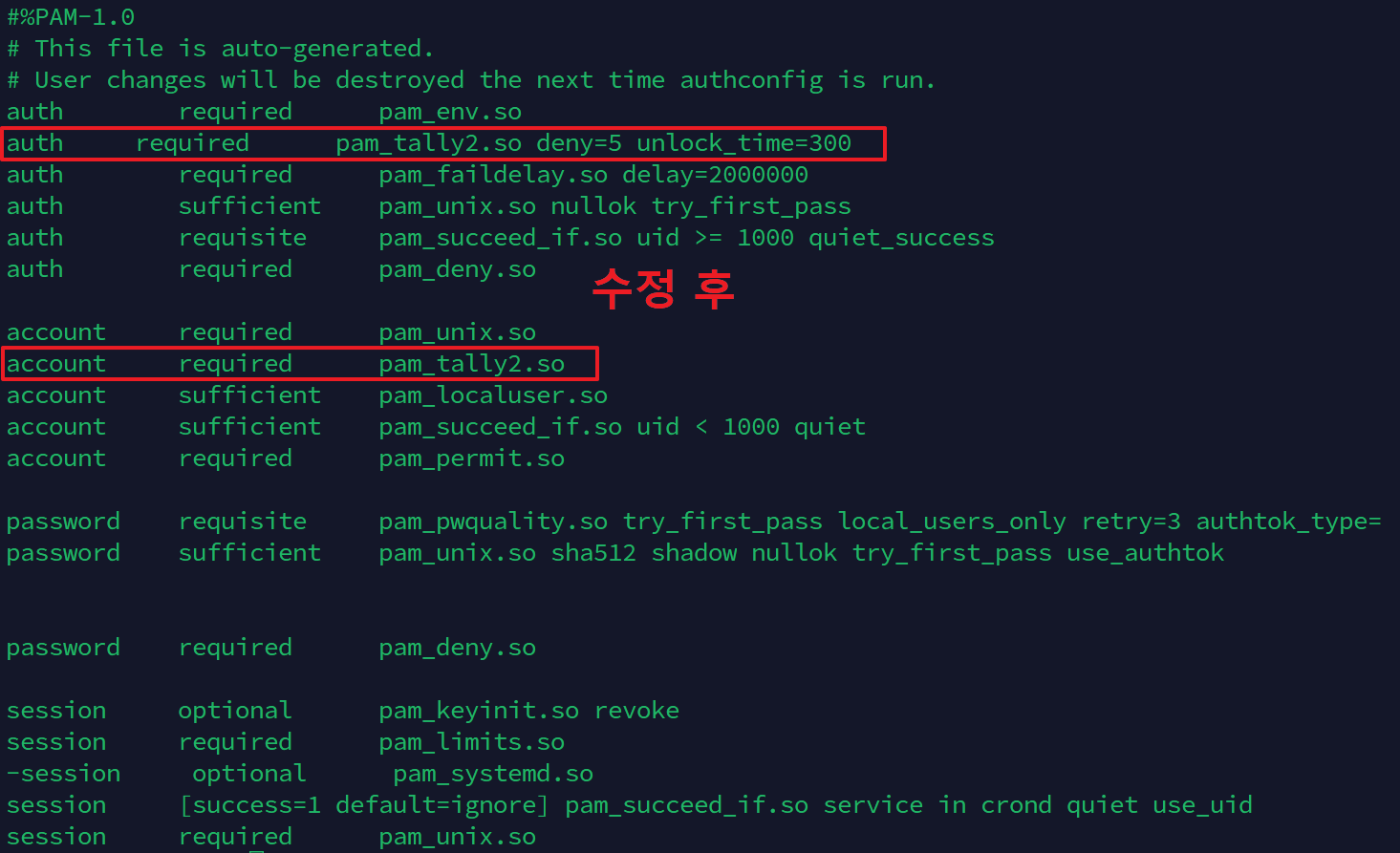 - password-auth 파일의 경우 x-window 로그인 및 ssh 원격 접속 시 임계값을 설정할 수 있습니다.