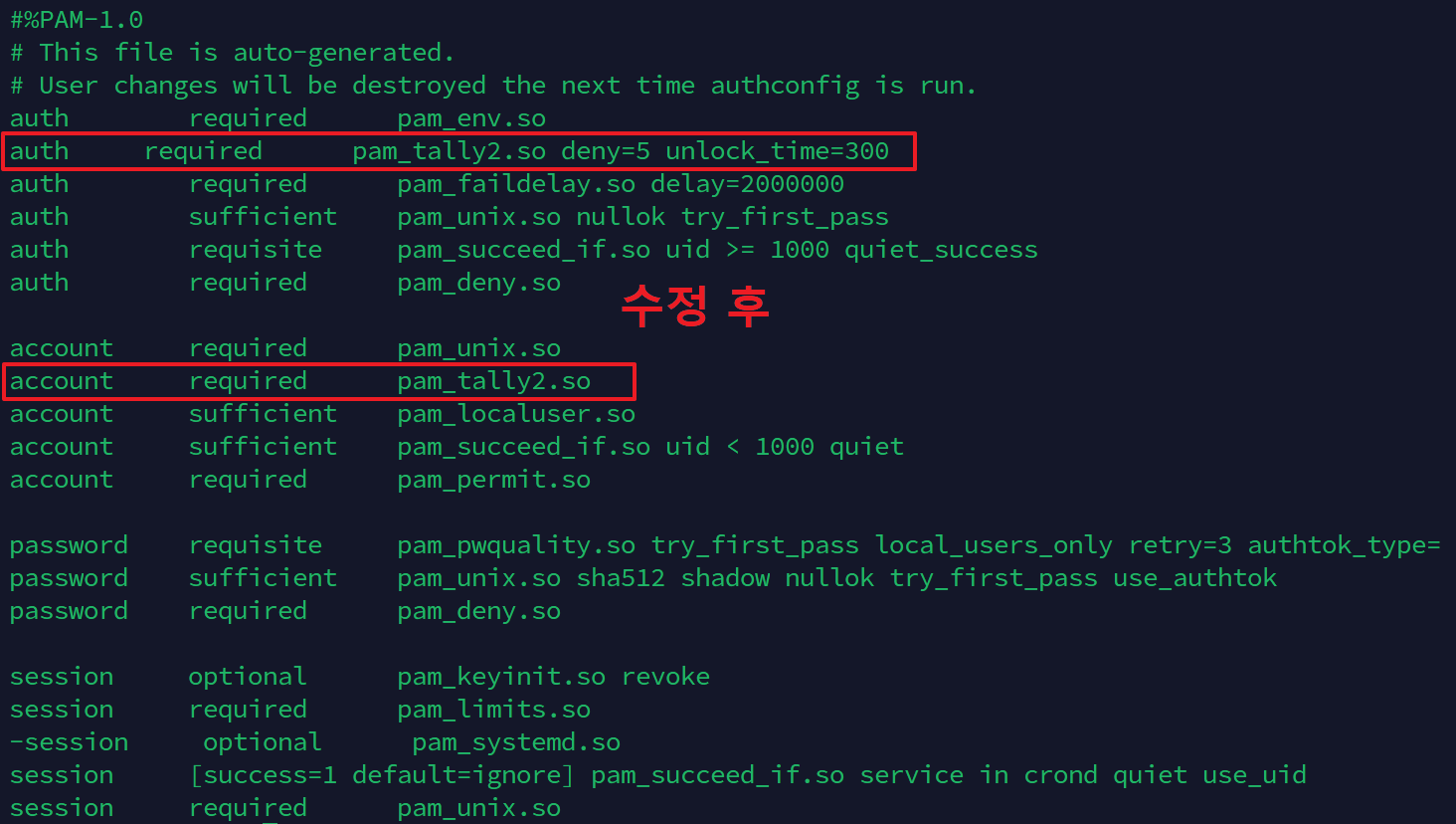 - password-auth 파일의 경우 x-window 로그인 및 ssh 원격 접속 시 임계값을 설정할 수 있습니다.
