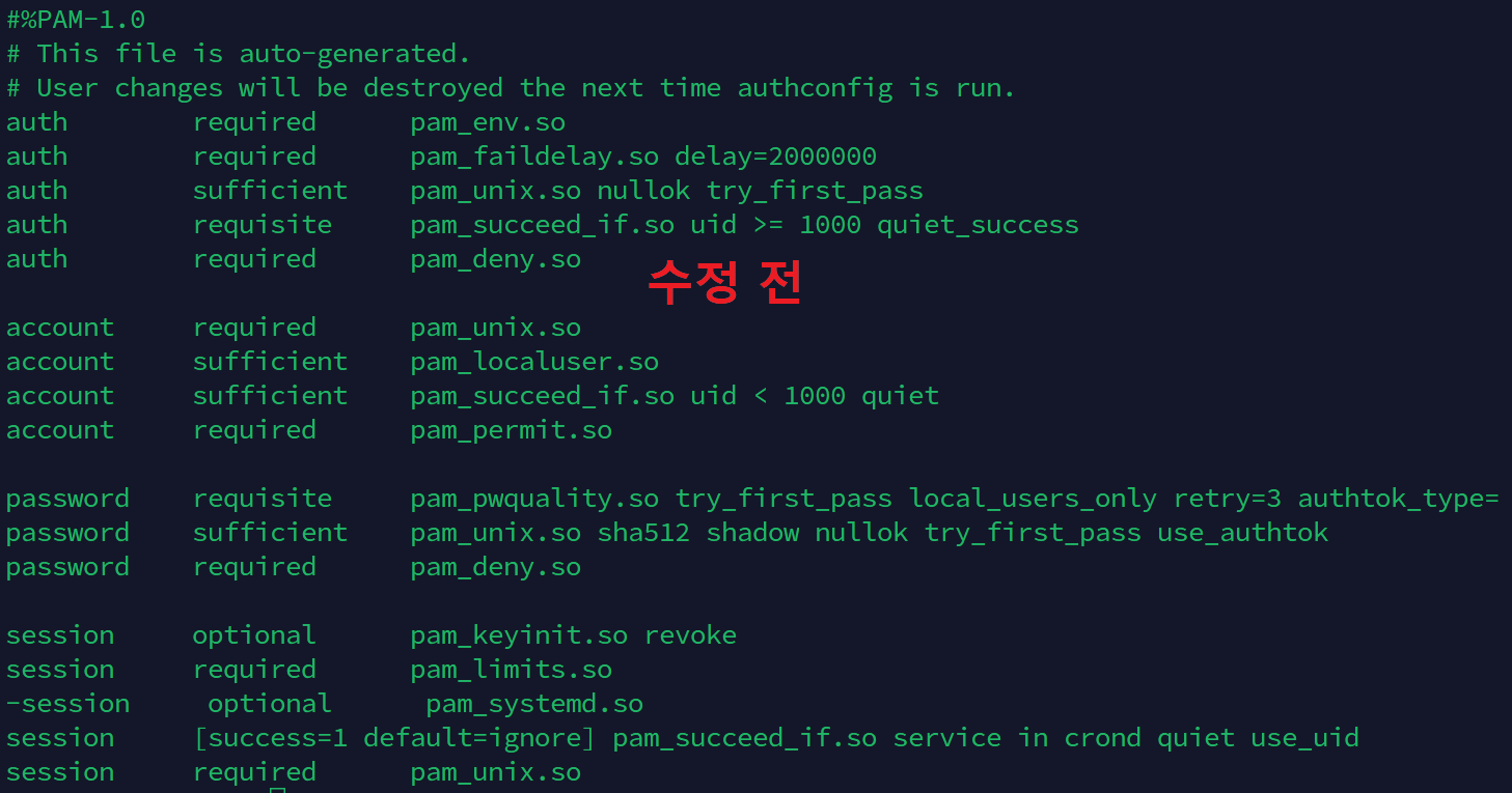 - system-auth 파일의 경우 콘솔을 통한 로그인 및 su 전환 시 임계값을 설정할 수 있습니다.